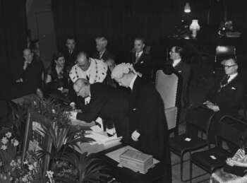 Gibson/Rutherford freedom ceremony. Ex-Provost Rutherford signing the Kirkintilloch Burgess Roll. 24 March 1955.