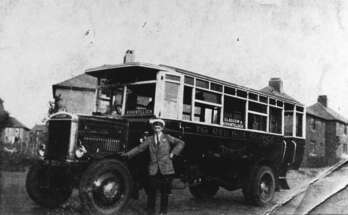 Red Bus Service Leyland 'Atlanta' on Glasgow-Kirkintilloch service at Loch Road, c 1925, with driver W Carson.