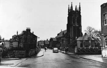 Steel swing bridge (built 1933) at Townhead, Kirkintilloch, looking north. The modern canal bridge-keeper's house dating from the 1930s can be seen on the right of the picture in front of St. Mary's Church.