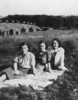 Residents behind Miners' Rows. Three sisters, from left to right, Barbara Quinn nee Kelly, Norah Boyle nee Kelly and Mary Cassiday nee Kelly, married James Cassiday, local Mavis Valley miner, later moved to new council house in Auchinairn.