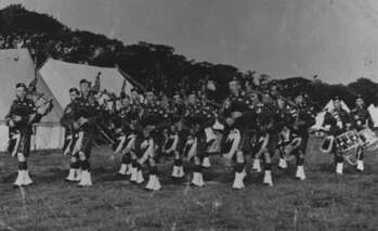 Chryston & District Pipe Band. Pipe-Major Harry Proud of Chryston Pipe Band leading T.A. Band at Gosforth Park, Newcastle, August 1938.