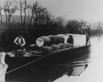 Glasgow Road. Buchanan & Co. Clydesdale and barge loaded with whisky, on the occasion of the opening of 'The Stables', November 1981.