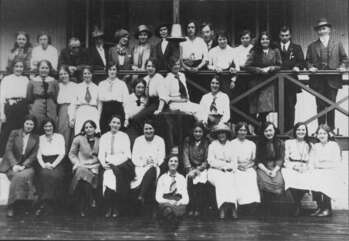 Lenzie Academy. Group of girls and teachers, c.1914, with Mr. Alex. Buchanan, rector, on extreme right. Believed taken at Craigmarloch.