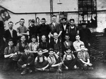 South Bank Iron Works, Machine Shop. Group of workmen, with apprentices in front. (From collection of Mr. David Thomson).