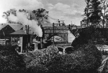 Aqueduct, Kirkintilloch, view from south. Built in the early 1770s to carry the canal over the Luggie Water with on the right the end of the culvert built to carry the Campsie Branch of the Edinburgh & Glasgow Railway under the canal and over the stream. Aitken's pleasure steamer 'May Queen' has been artificially sketched in.