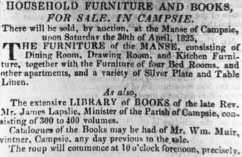 Old Campsie Parish Church. Manse. Notice re sale of "Household Furniture and Books", 1825 (Glasgow Courier, 26 April 1825).