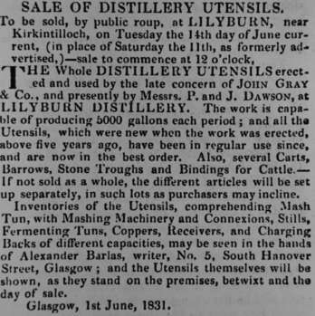 Lilyburn Distillery, Milton of Campsie. Distillery utensils advertised for sale (Glasgow Courier, 4th June 1831).