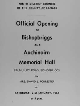 Bishopbriggs and Auchinairn Memorial Hall, Balmuildy Road, Bishopbriggs. Programme of opening ceremony, 1961.