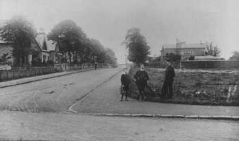 Heriot Road, Lenzie, view looking west from junction with Victoria Road. The houses in the picture were built during the 1870s, as part of the major expansion of Lenzie at that period. The villa on the right was designed by Robert Turnbull, a partner of the famous Alexander \'Greek\' Thomson.
