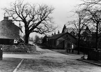 Old School, Roman Road, Bearsden. Behind the school is the Schoolmaster's house and on the left is Meldrum's Stables. Three children stand on the corner in front of the school with their bicycle and a little dog is on the opposite corner of the crossroads of Drymen Road and Thorn Road.
